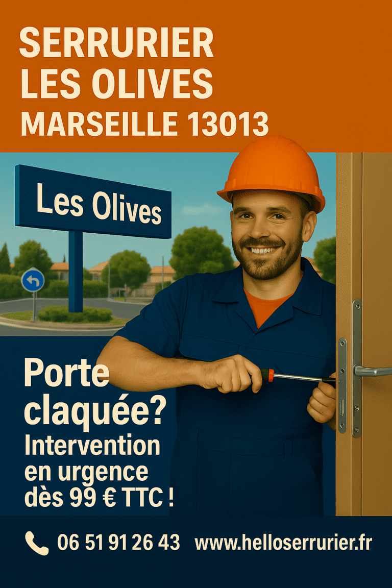 Un problème de serrure dans le quartier des Olives 13013 ? Hello Serrurier Marseille intervient 7j/7 pour ouverture de porte claquée, changement de cylindre ou mise en sécurité, avec des tarifs transparents et un service professionnel dans tout le 13ᵉ arrondissement.